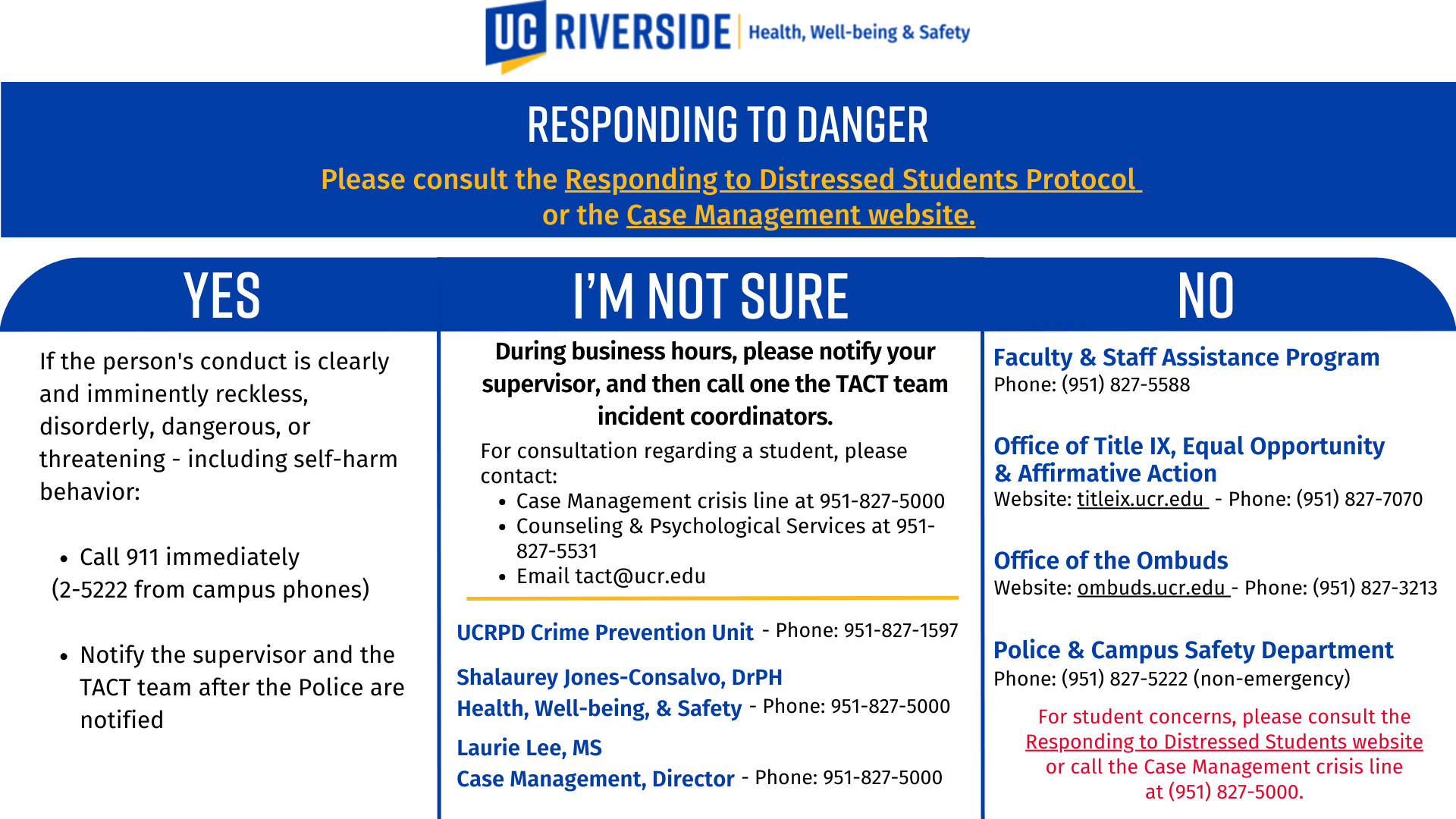 TACT is not a substitute for emergency response to an active or imminent threat to the safety of the university community. In event of urgent or imminent threat or danger, please call 911, or the UC Riverside police and campus safety department at 951.827.5222