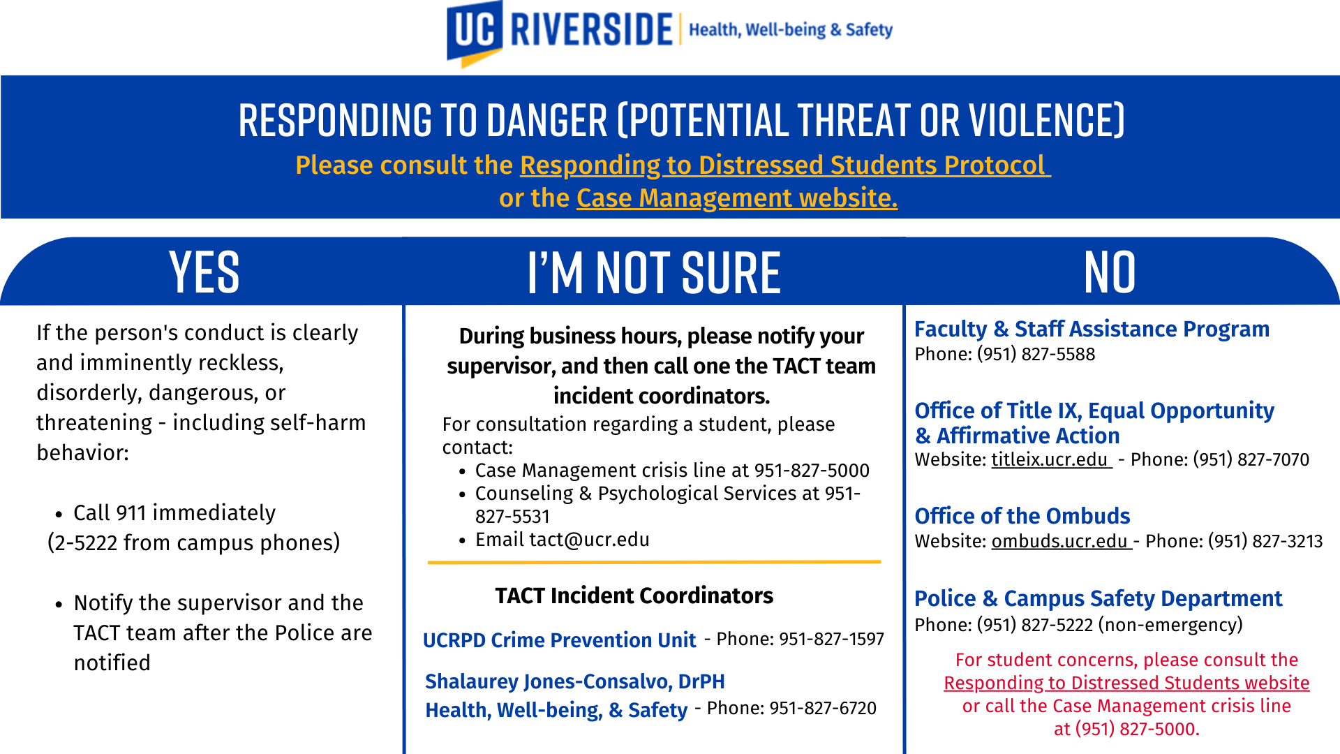 TACT is not a substitute for emergency response to an active or imminent threat to the safety of the university community. In event of urgent or imminent threat or danger, please call 911, or the UC Riverside police and campus safety department at 951.827.5222